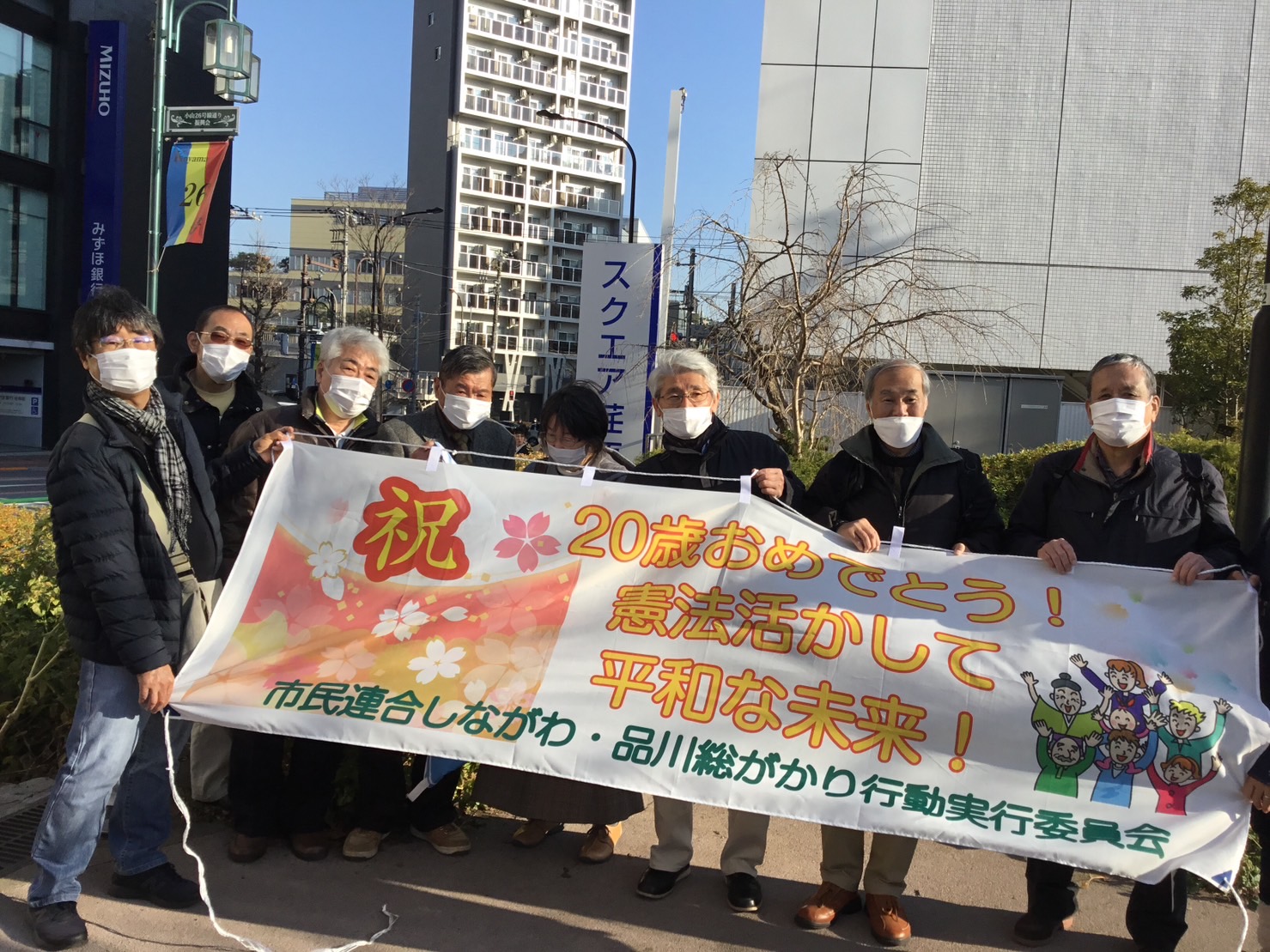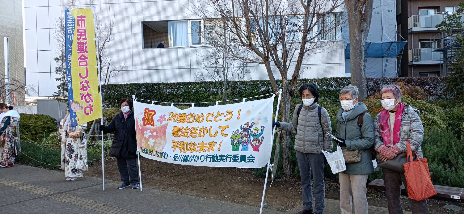 品川区「二十歳の集い」宣伝。午前の部は、8団体17人が参加し、市民連合しながわのニュースと日本国憲法(抜粋)リーフが入ったティッシュ45セット配布しました。他に教育チラシや平和を訴えるチラシを配りました。午後は1時半から7団体19人が参加し、ティッシュ55セット配布しました。用意したニュースと憲法リーフ100セットはなくなりました。